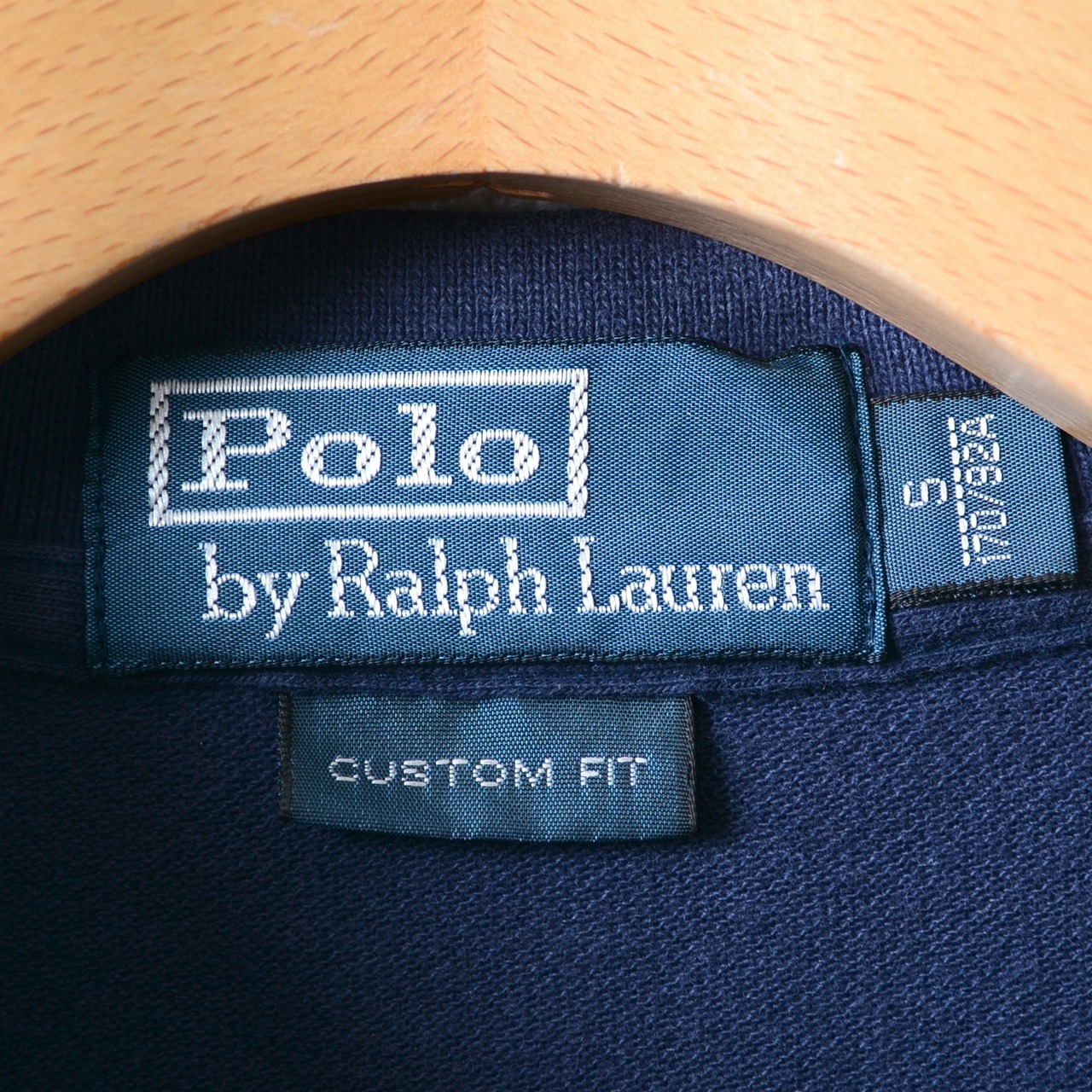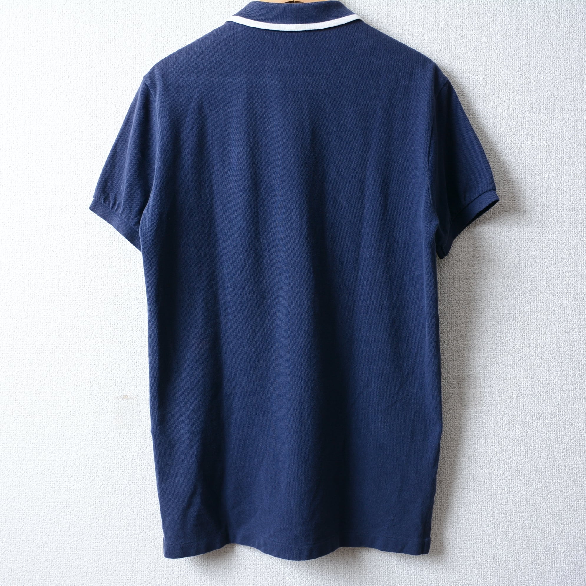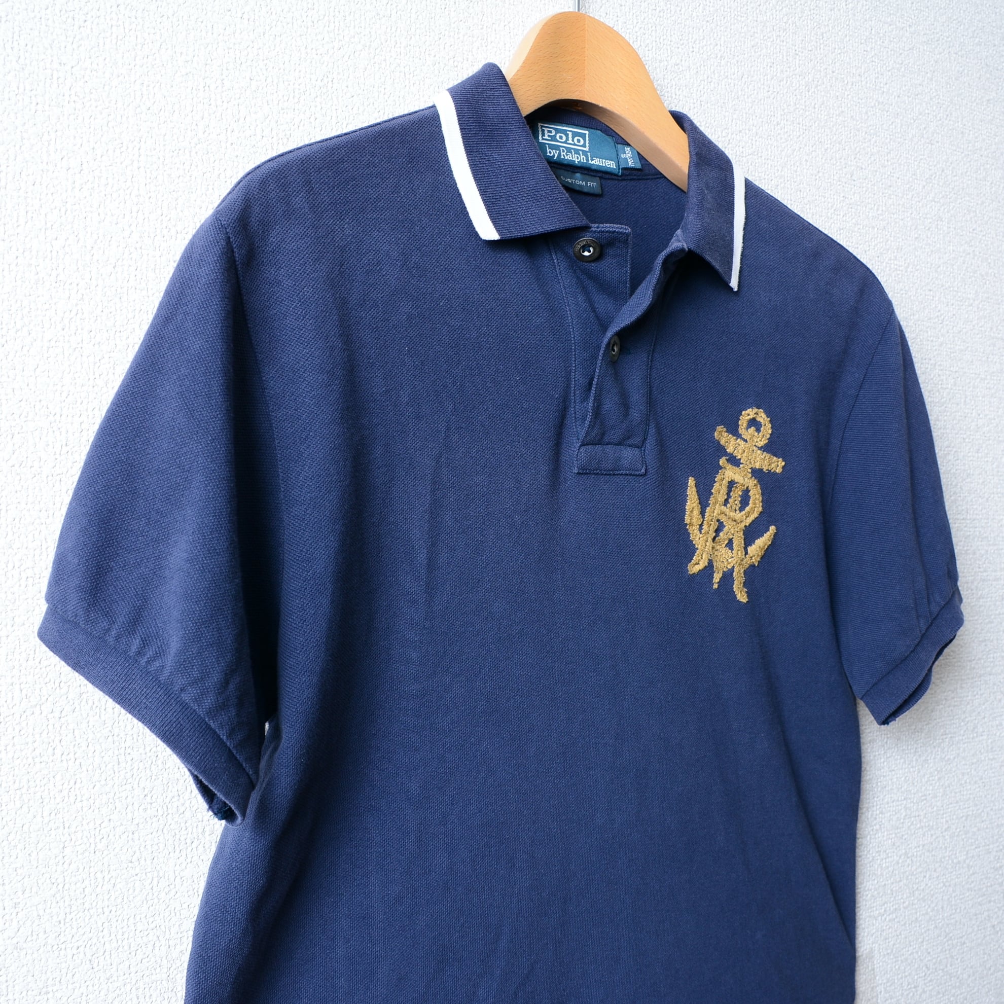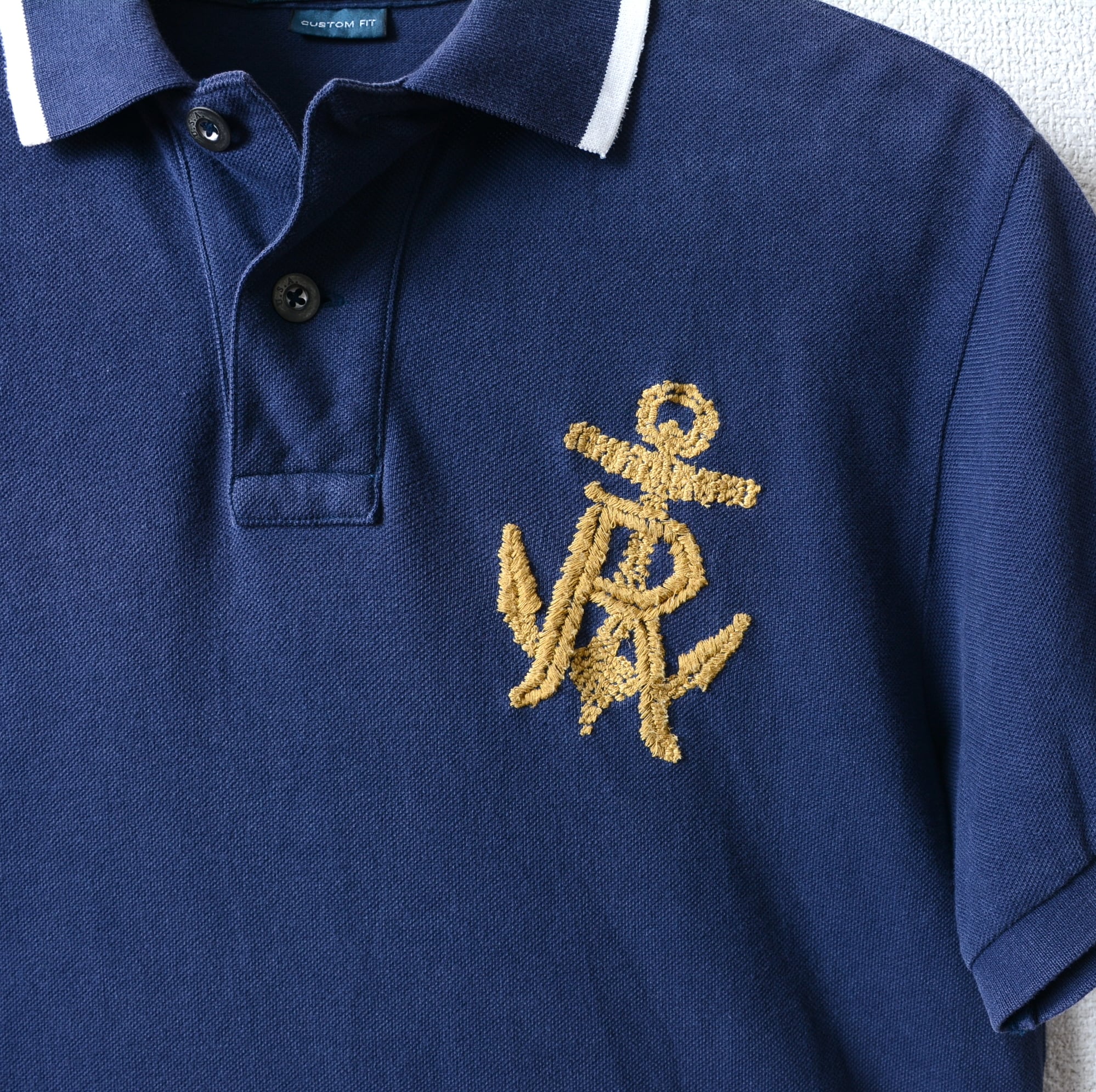 ネイビーのポロシャツ、アンカー刺繍ロゴ付き、US Sサイズ。