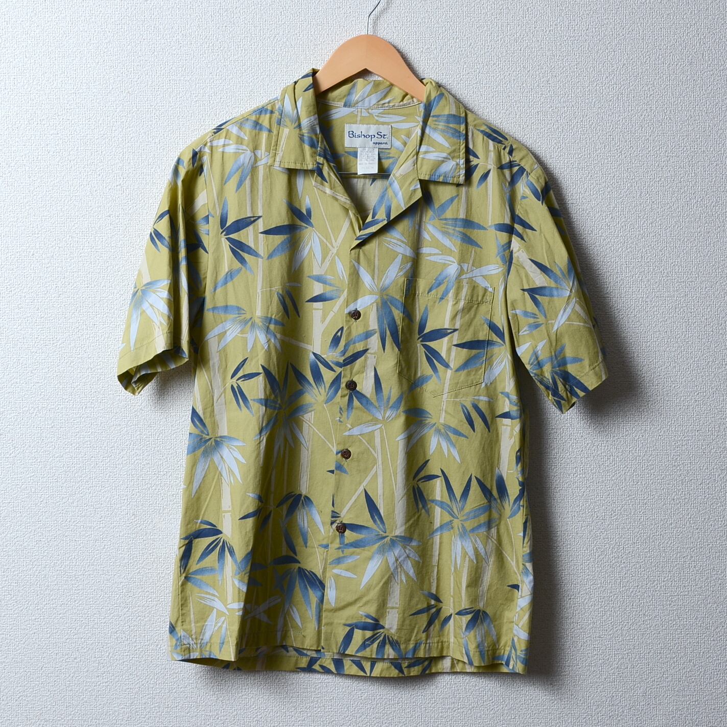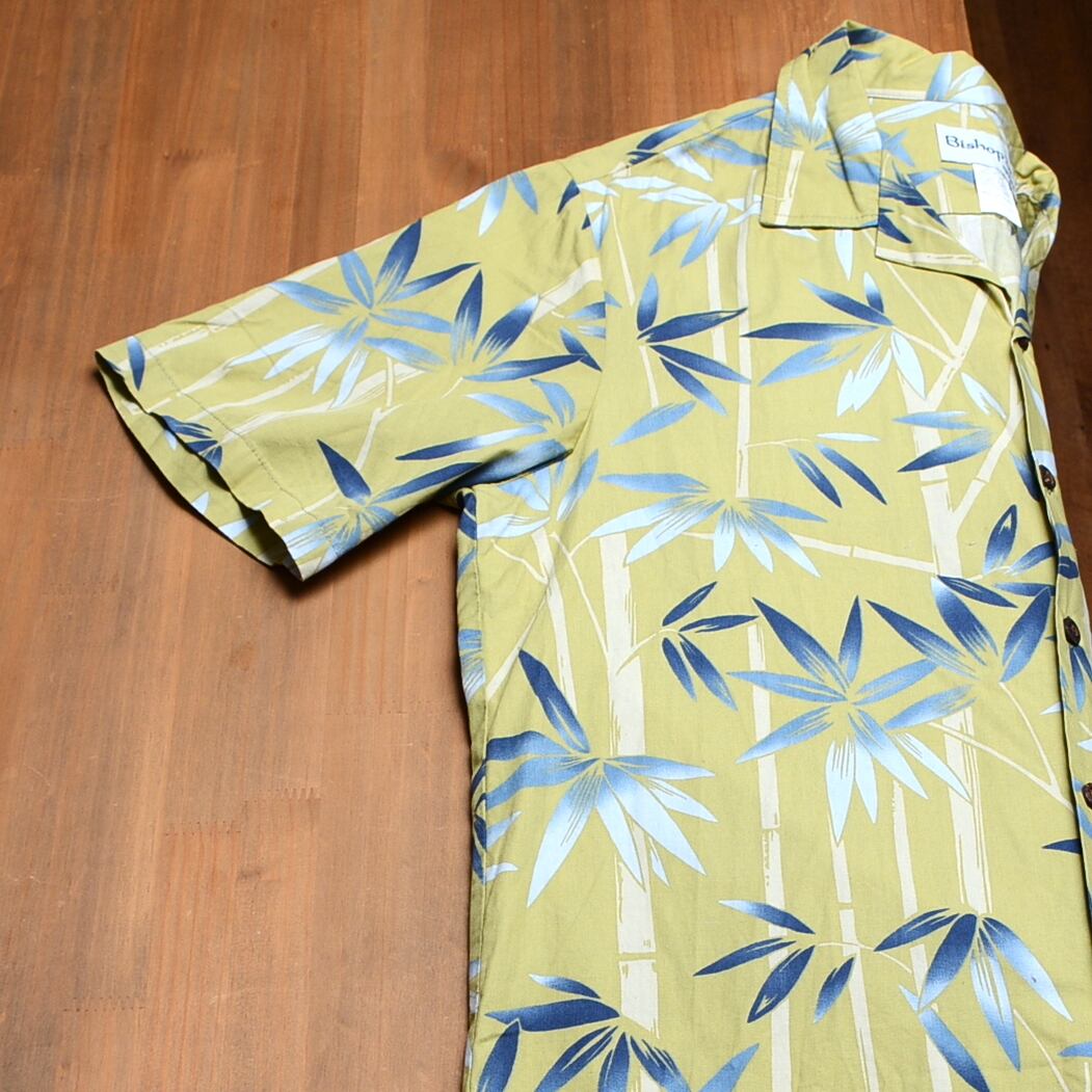 ハワイ製のBishop St.アロハシャツ、黄緑に青の竹模様が特徴的。
