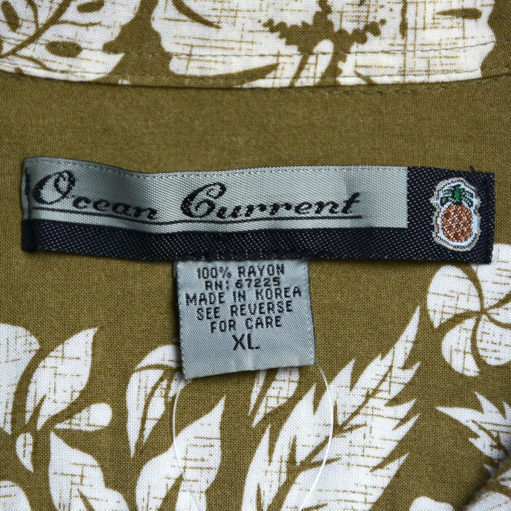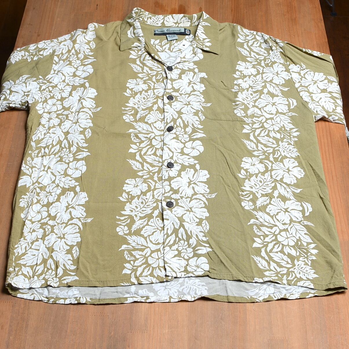 オリーブグリーンの花柄デザインのアロハシャツ、XLサイズでリラックスした着心地を提供します。