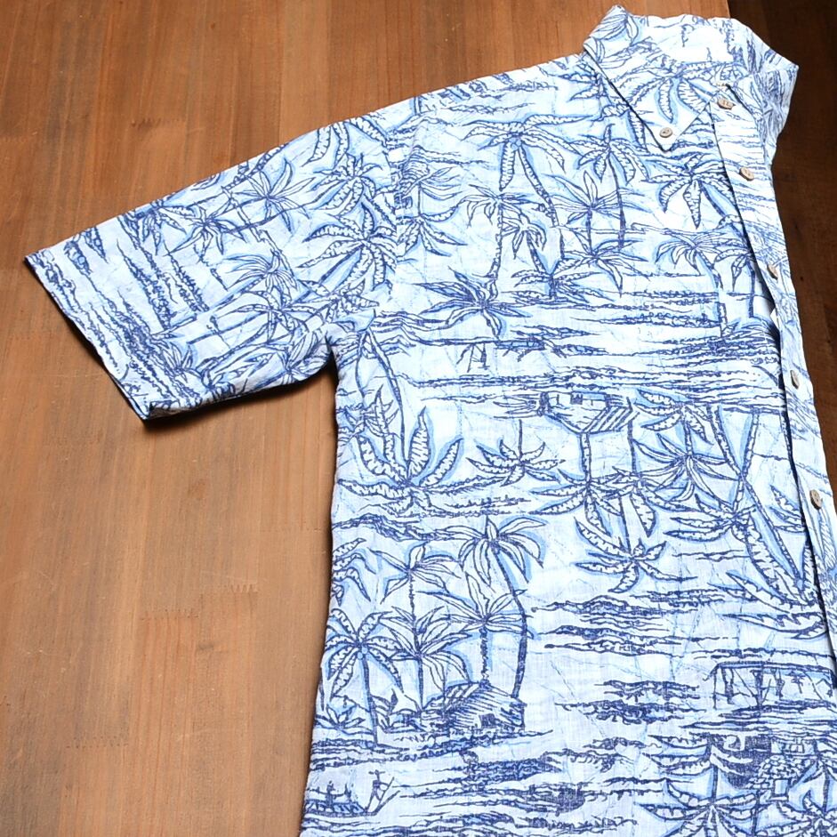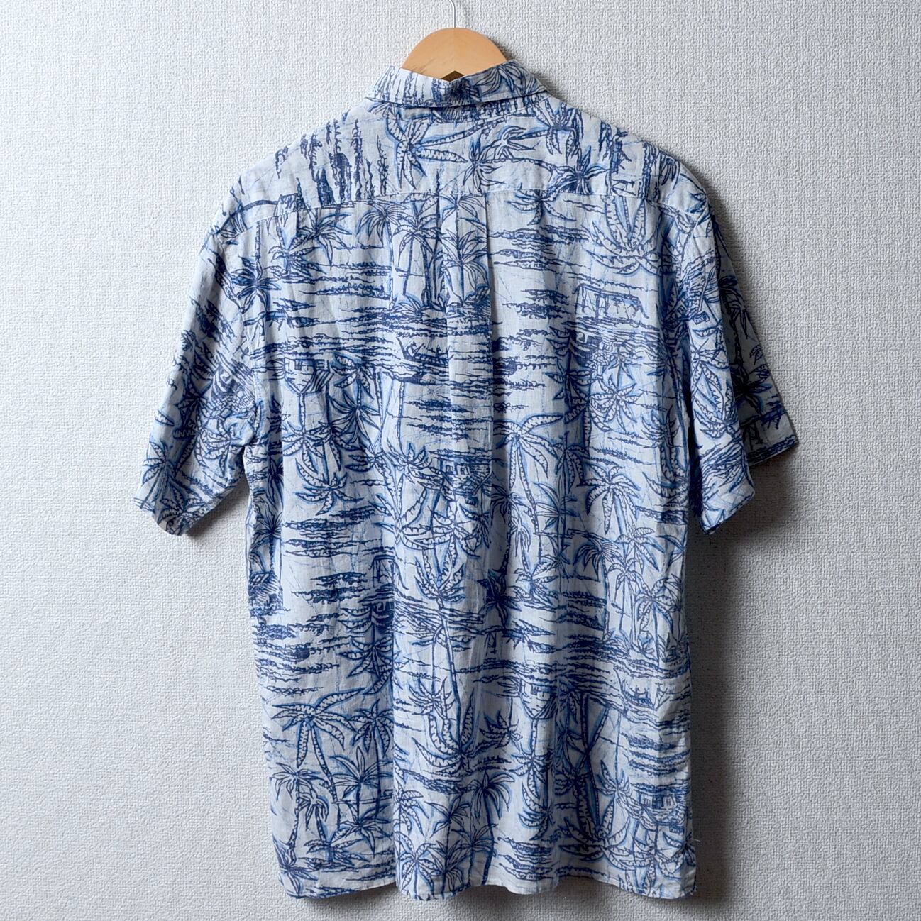 青と白のパームツリー柄のアロハシャツ、Lサイズ、US規格。