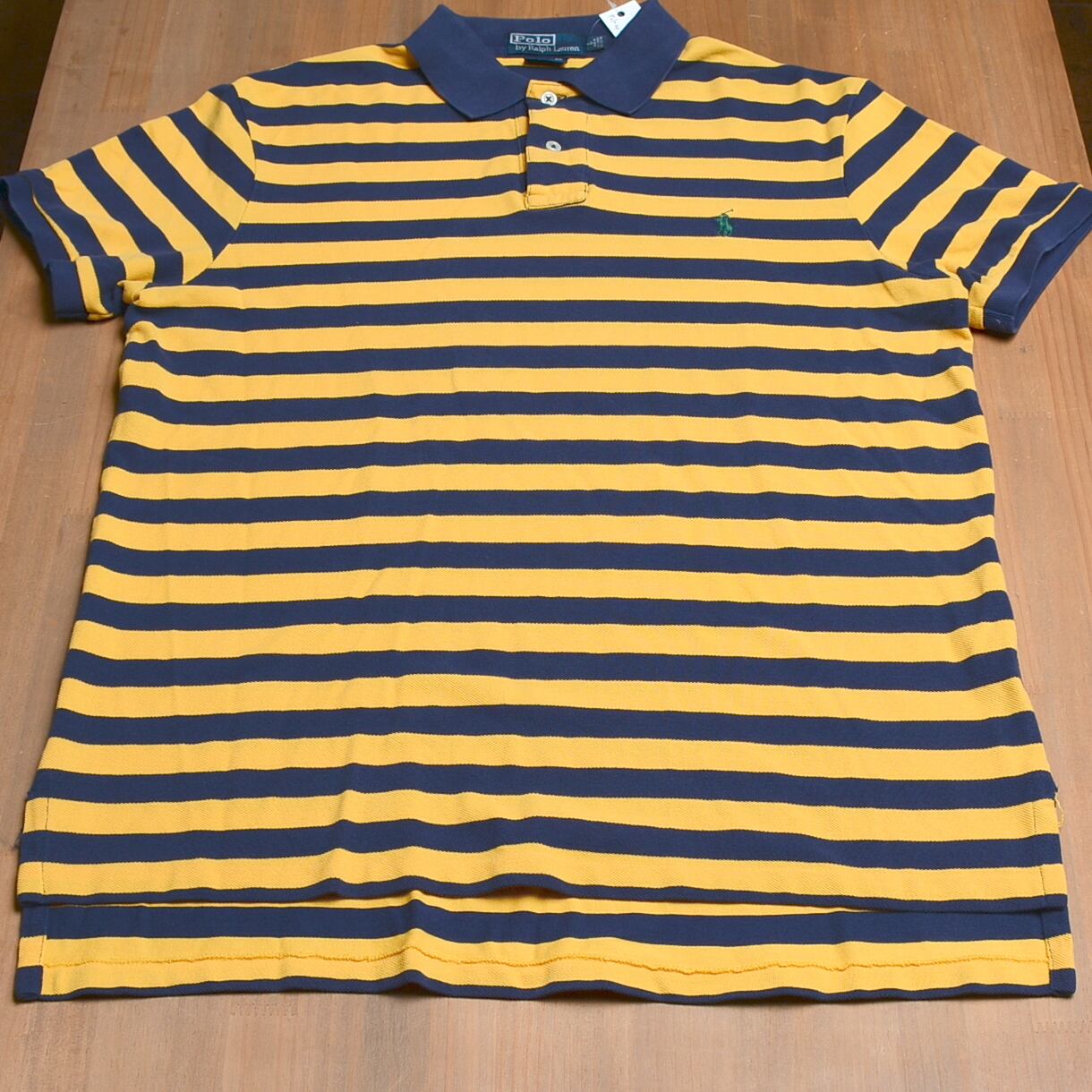 イエローとネイビーのストライプデザインのポロシャツ、Lサイズ。