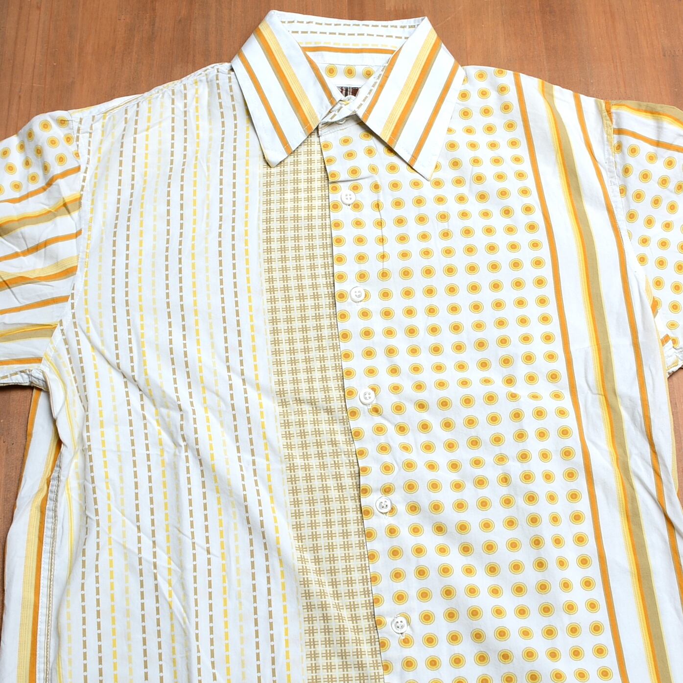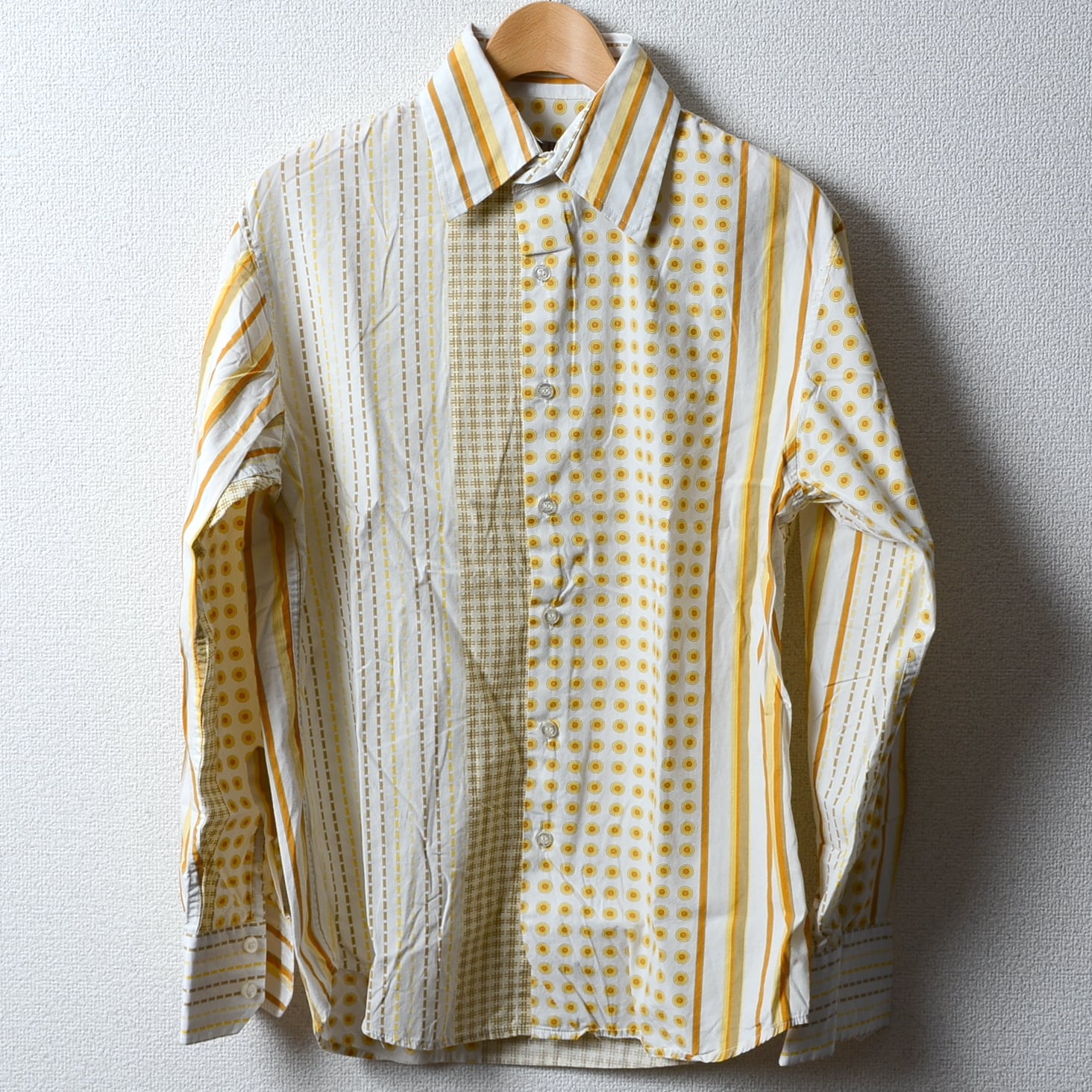 イエロー系のストライプとドットパターンのシャツ、US Mサイズ。