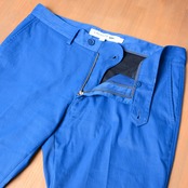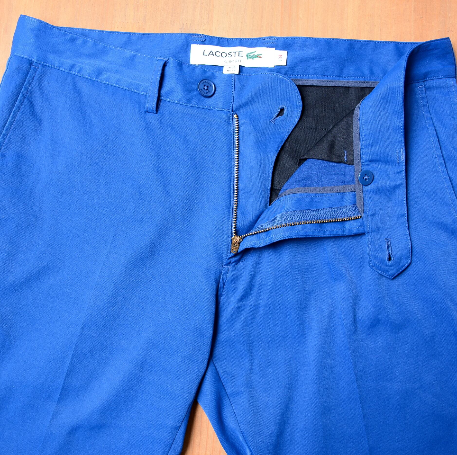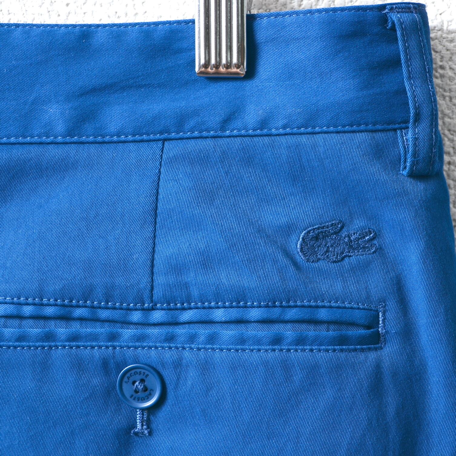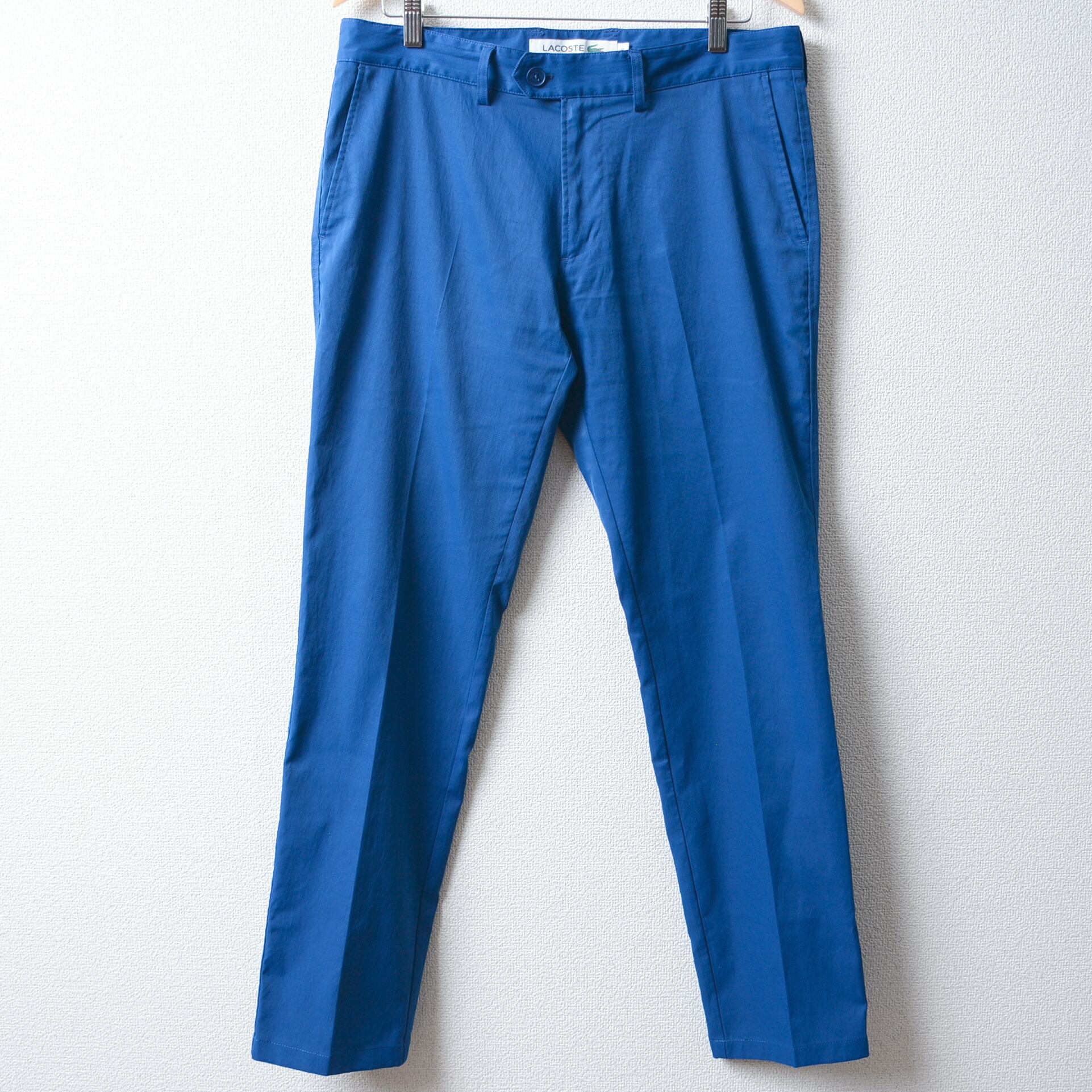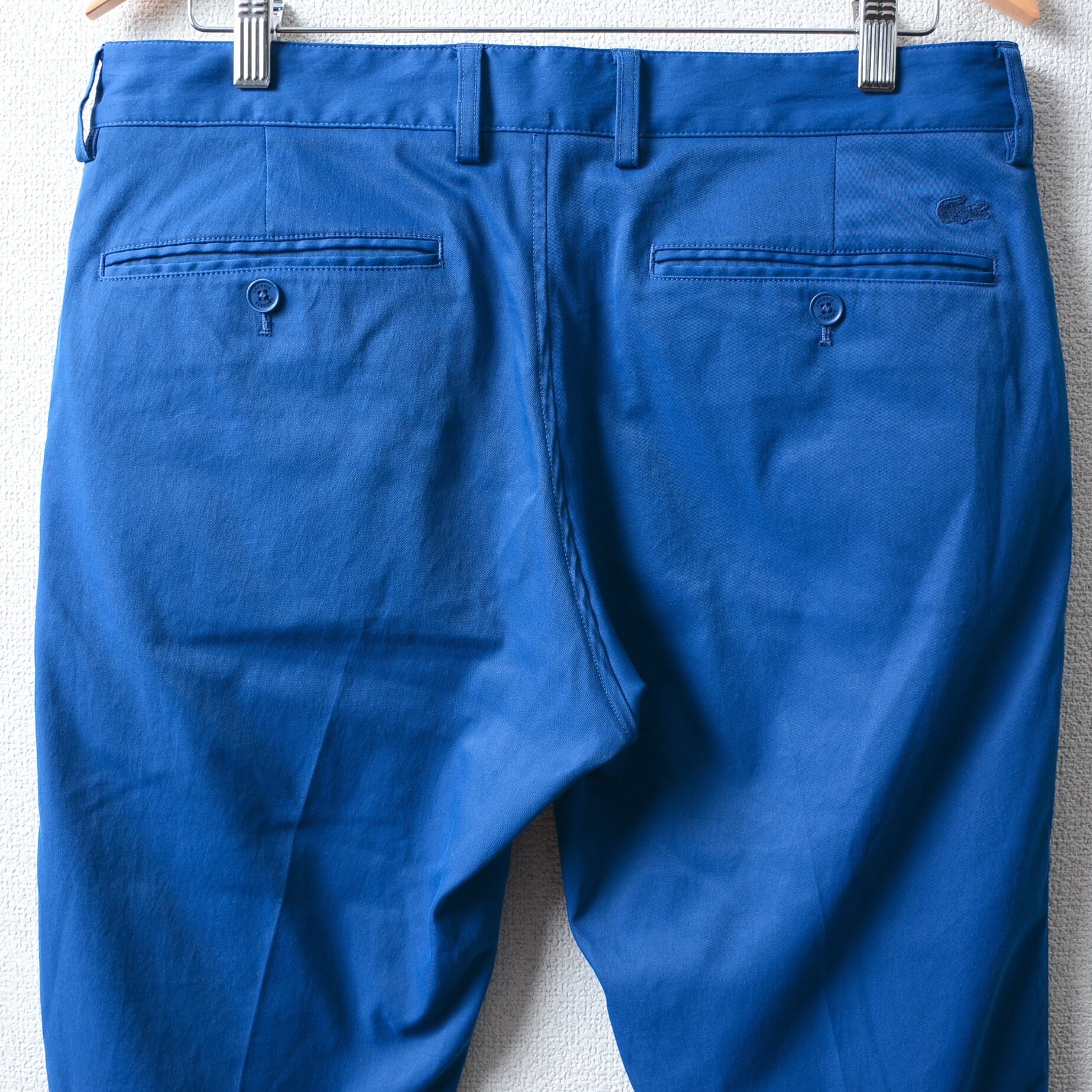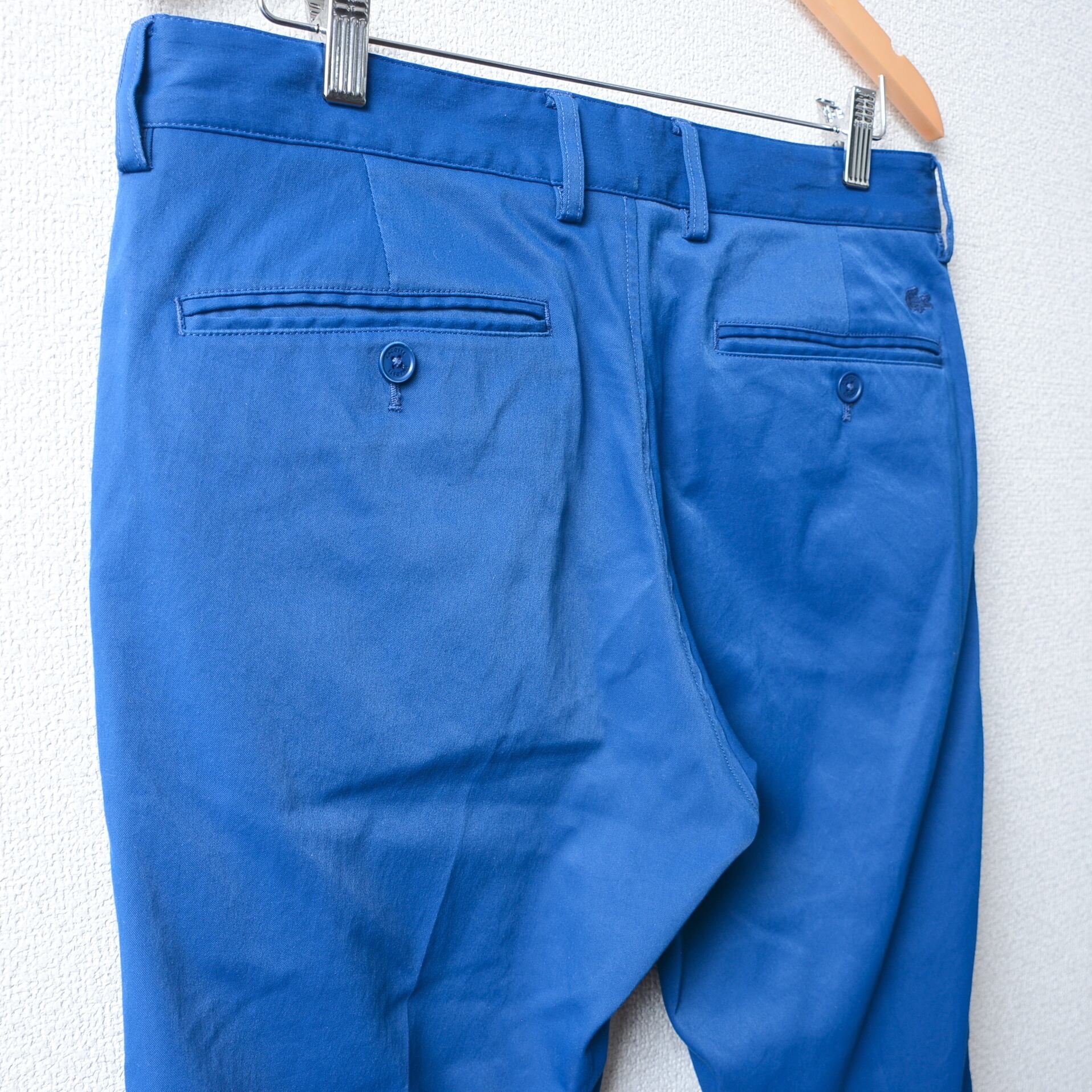 鮮やかな青色のLACOSTE製パンツ、W34L34サイズ、フロントジッパー付き。