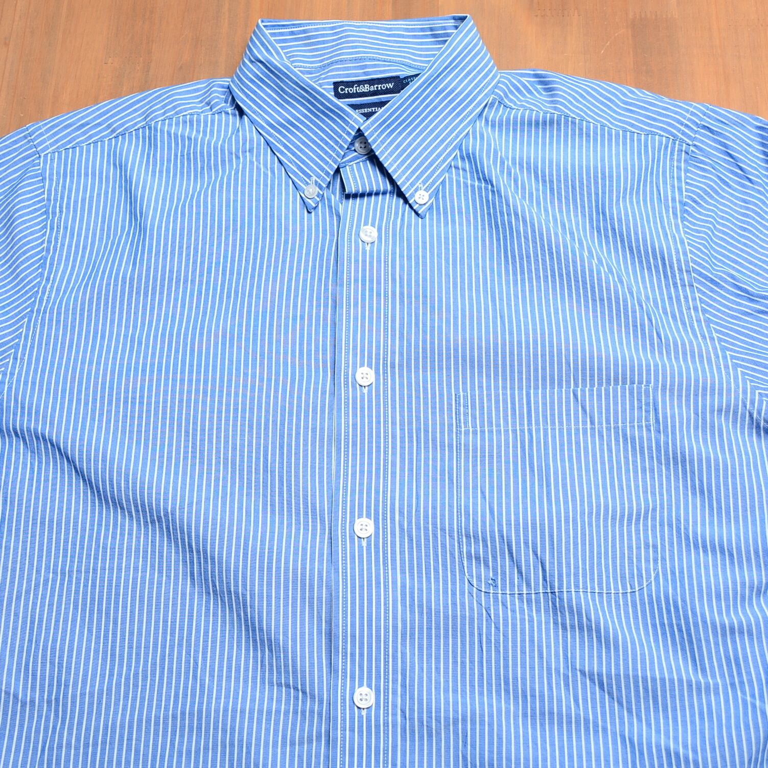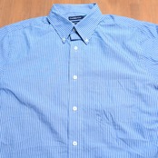 青のストライプデザイン、ボタンダウンの長袖シャツ。