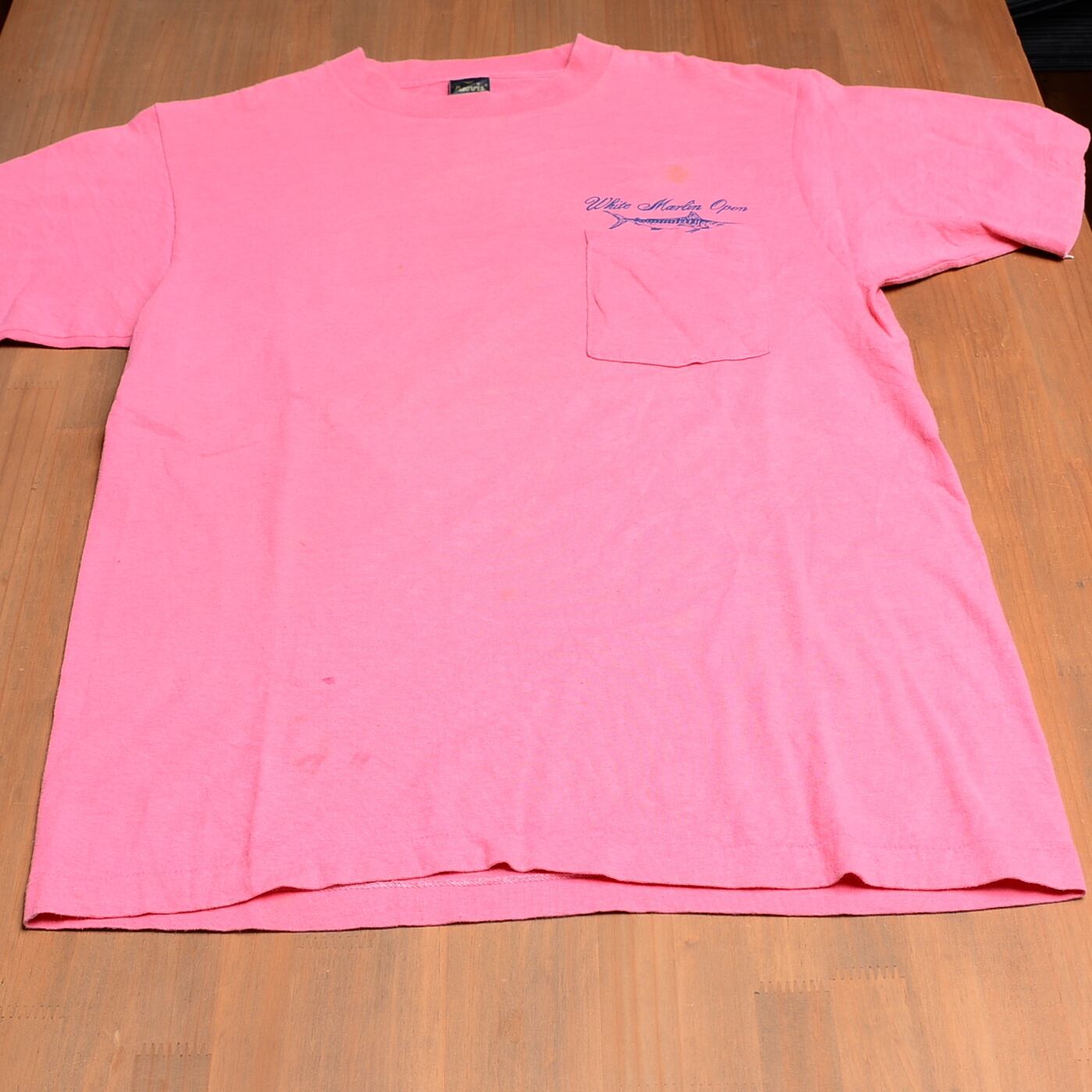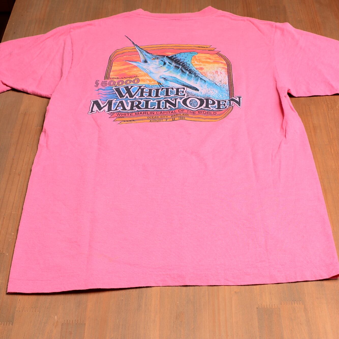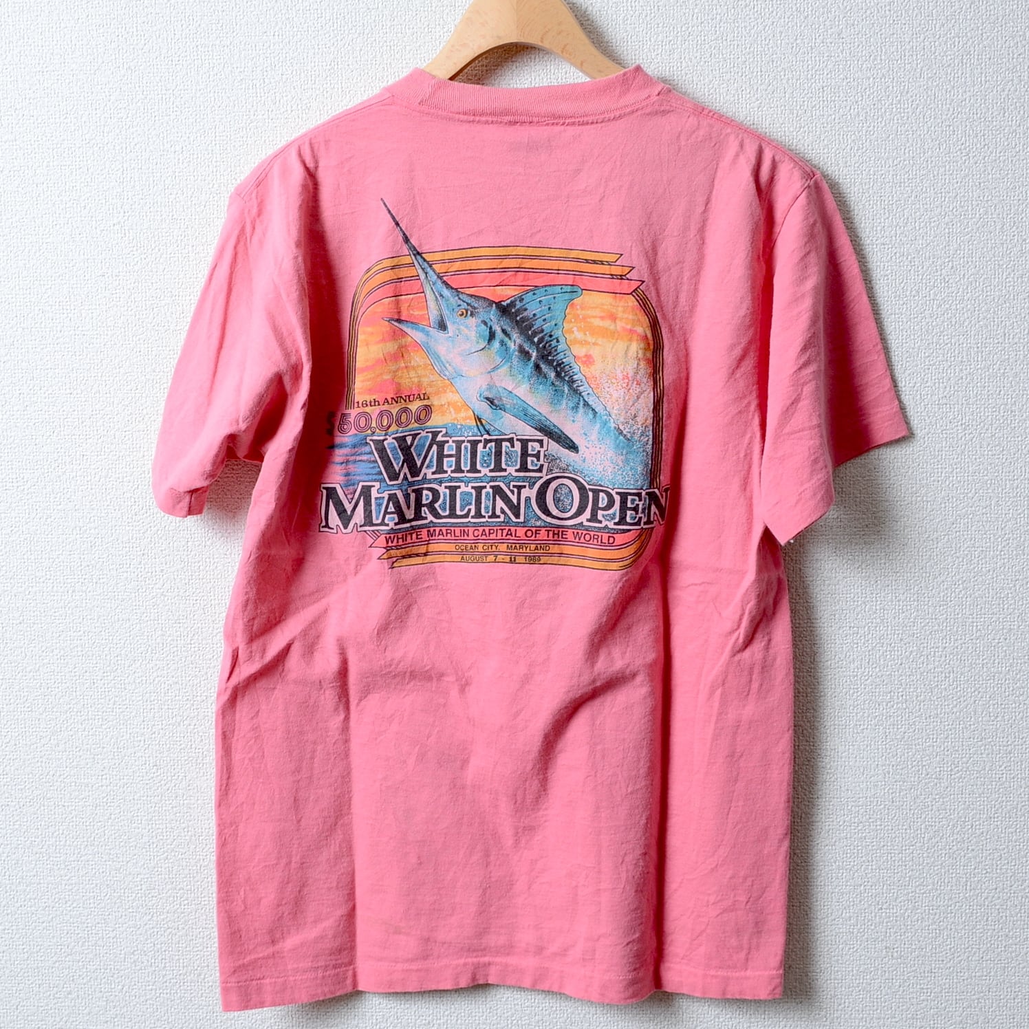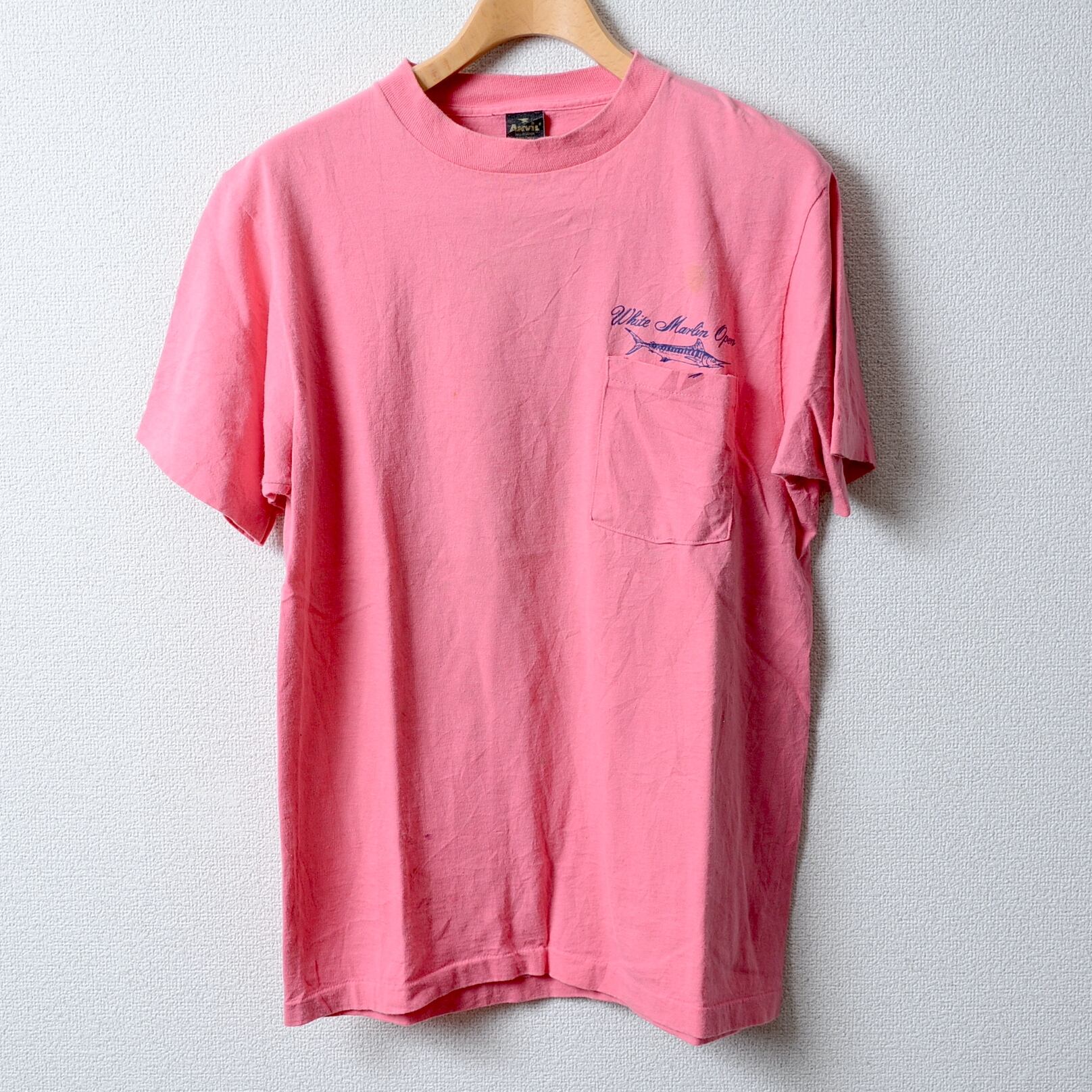 80年代のANVIL製ホワイトマリンオープンTシャツ、Lサイズ、ピンク。