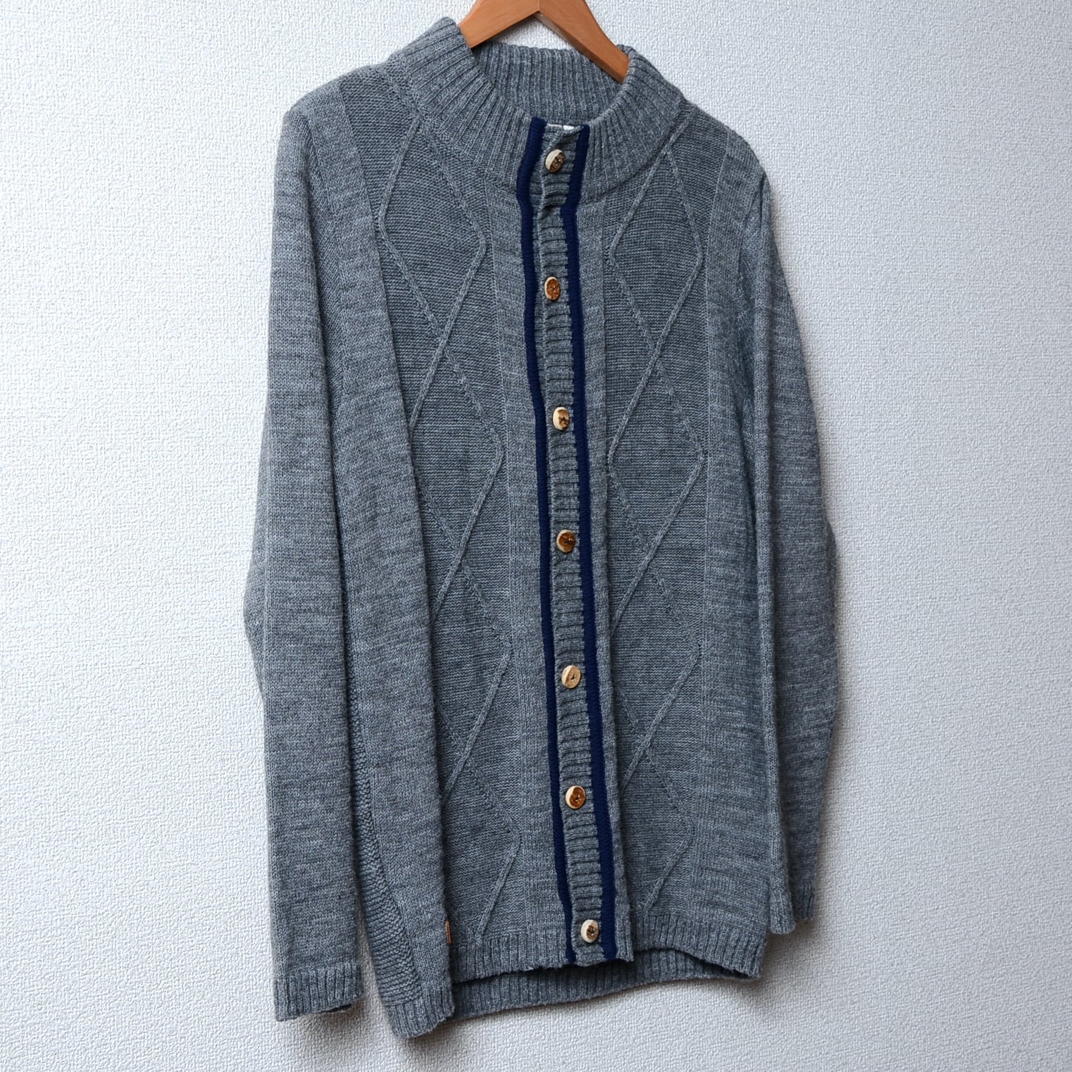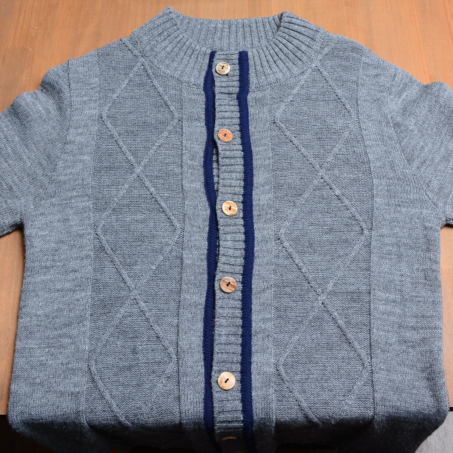 ダイヤモンド模様のグレーのカーディガン、鹿の角ボタンとネイビーのラインが特徴。