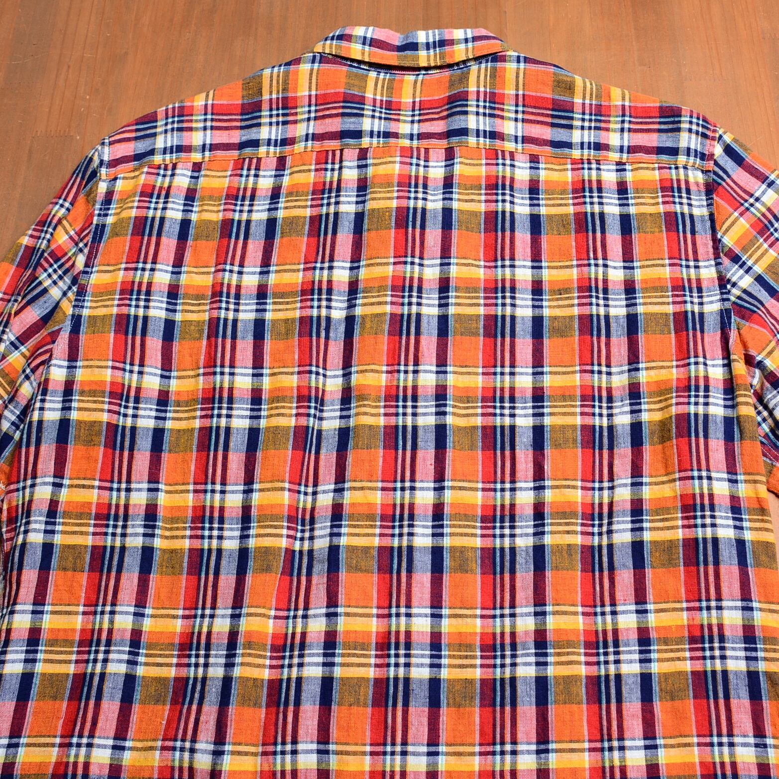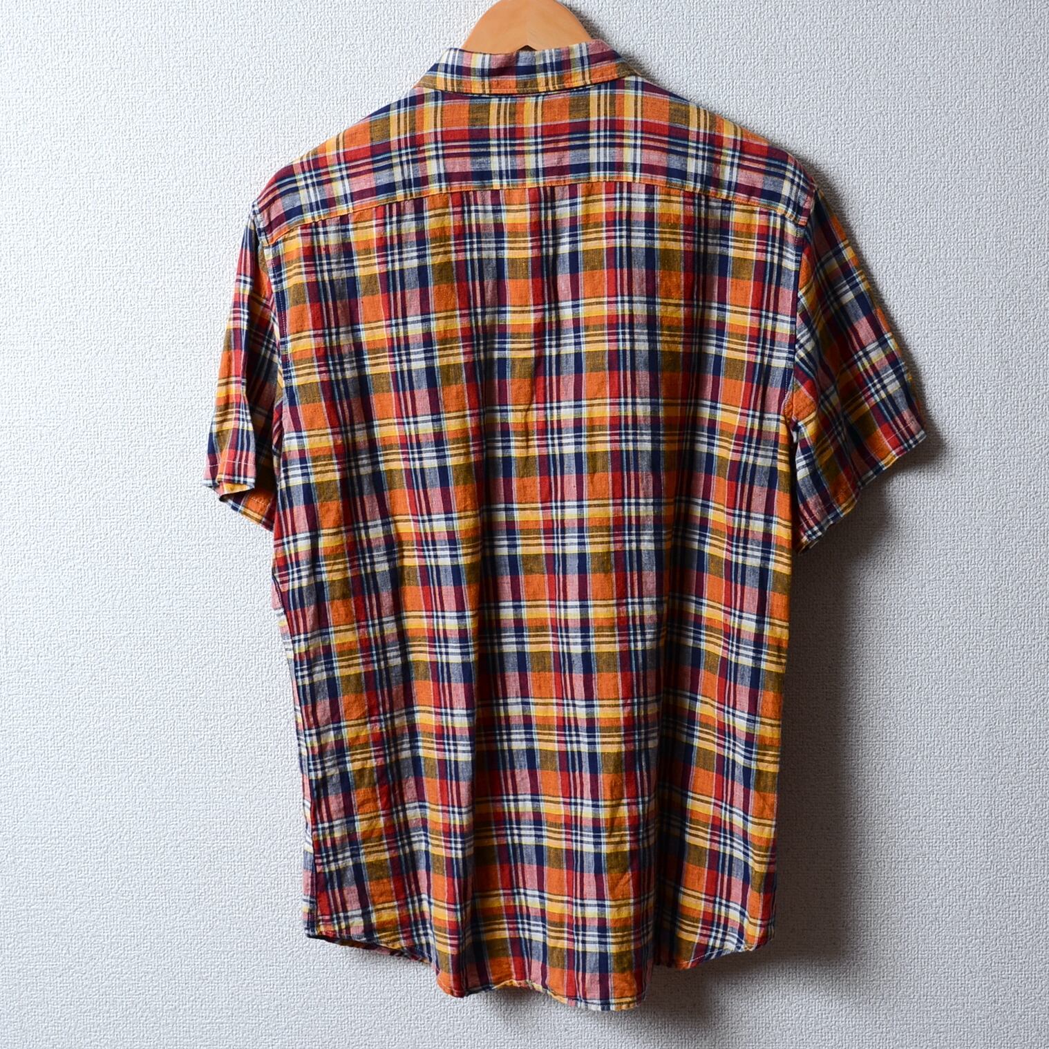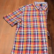 オレンジ系のチェック柄、Lサイズの半袖シャツ。