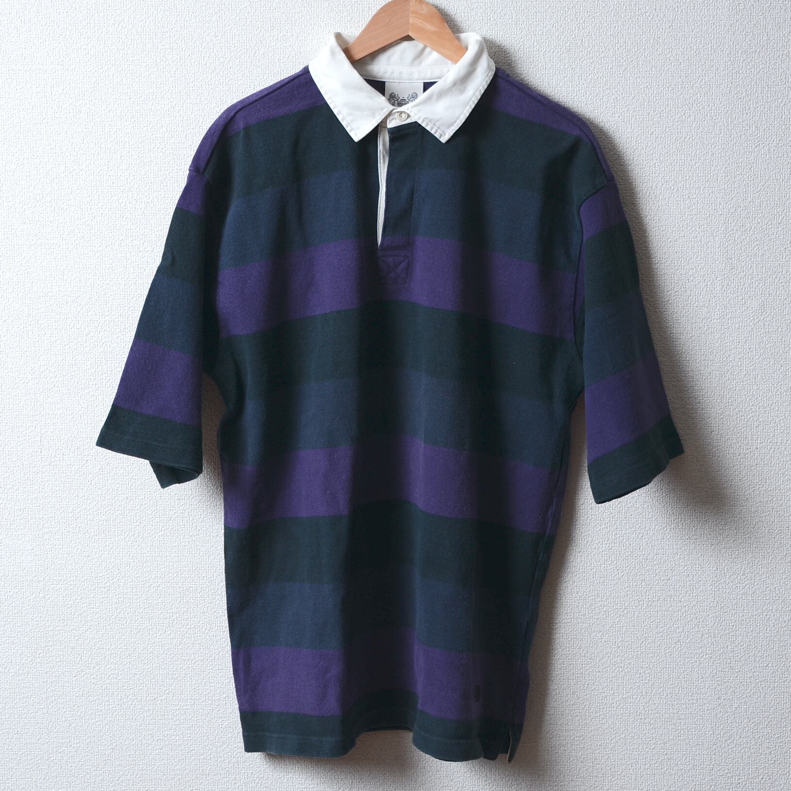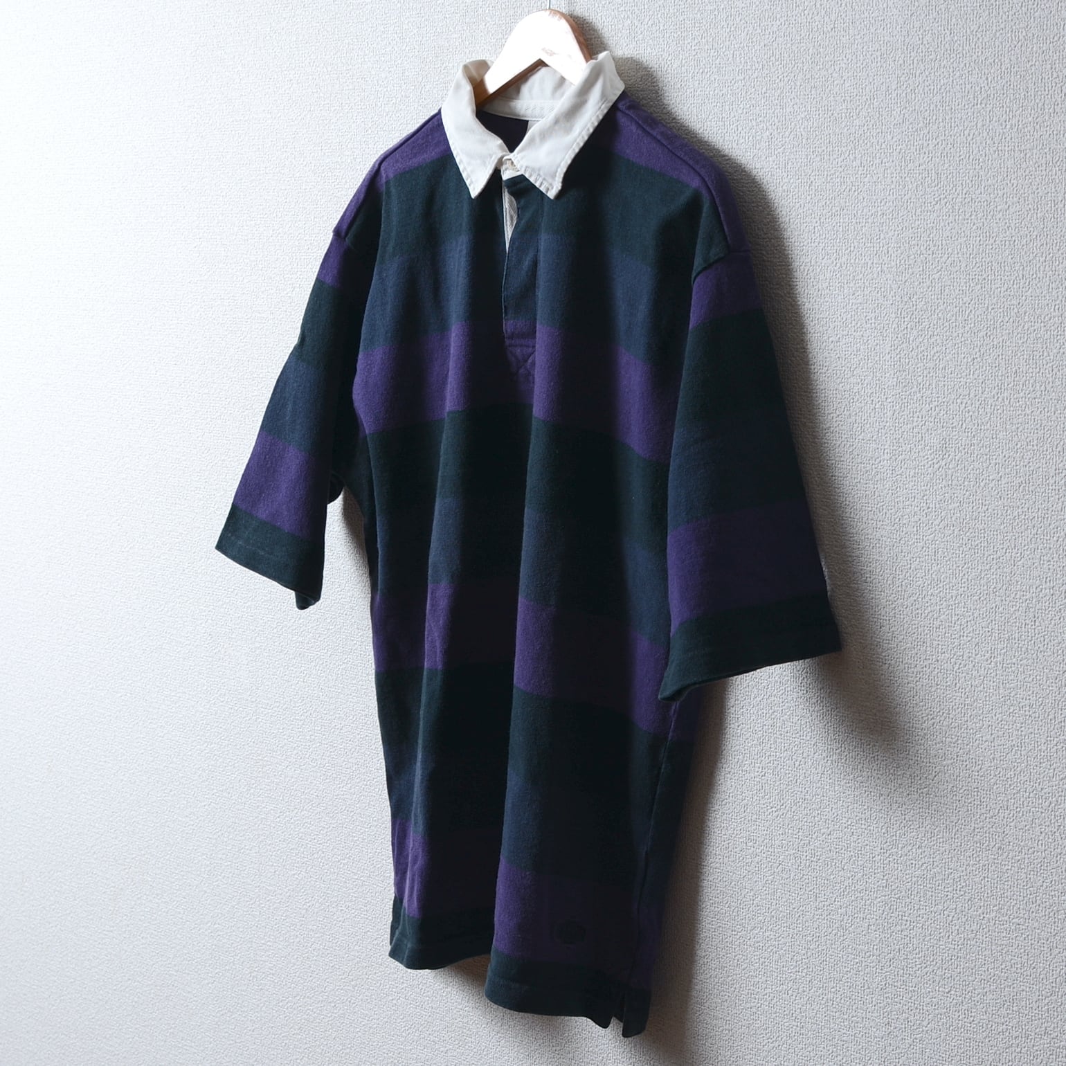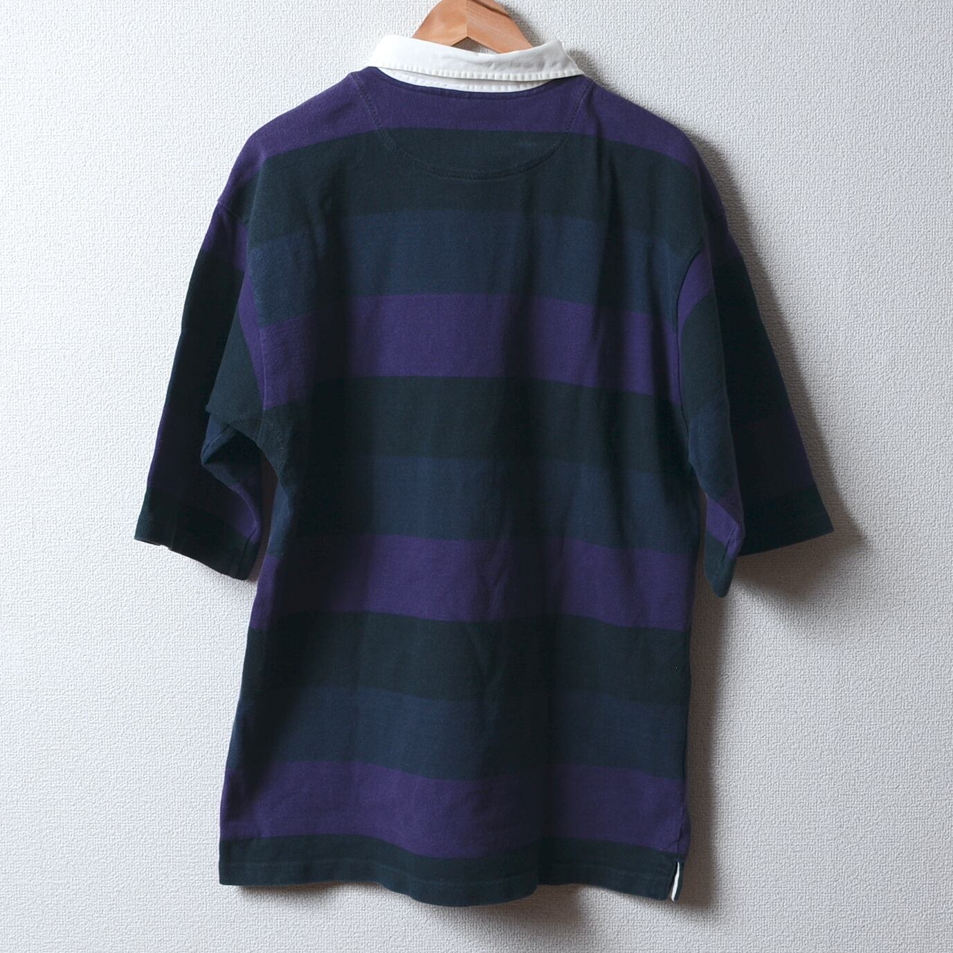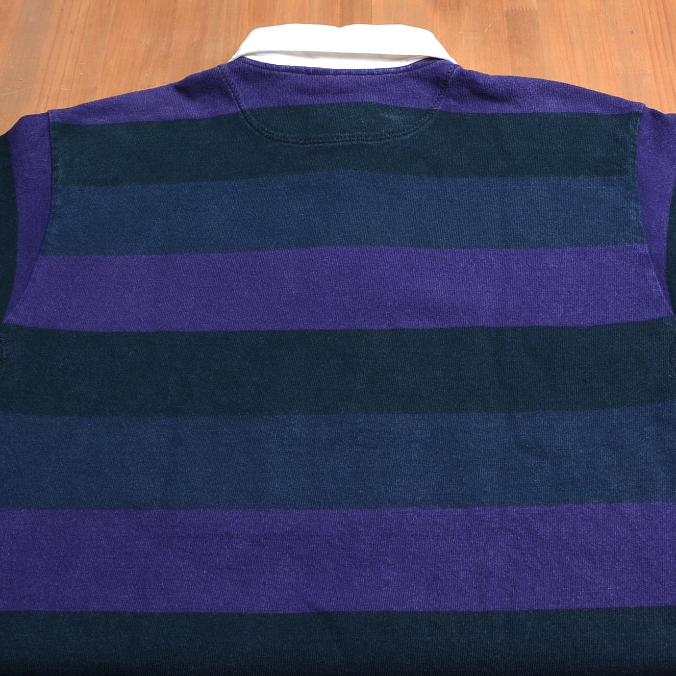 紫と黒のストライプデザインのコットンオックスフォードポロシャツ、US XLサイズ。