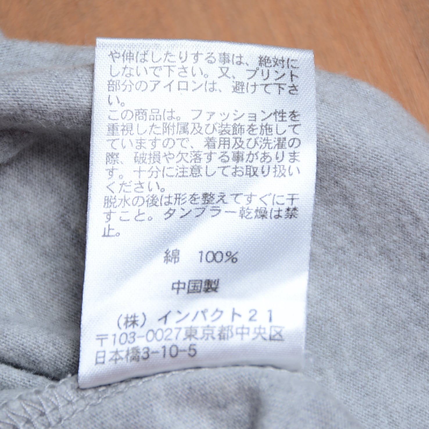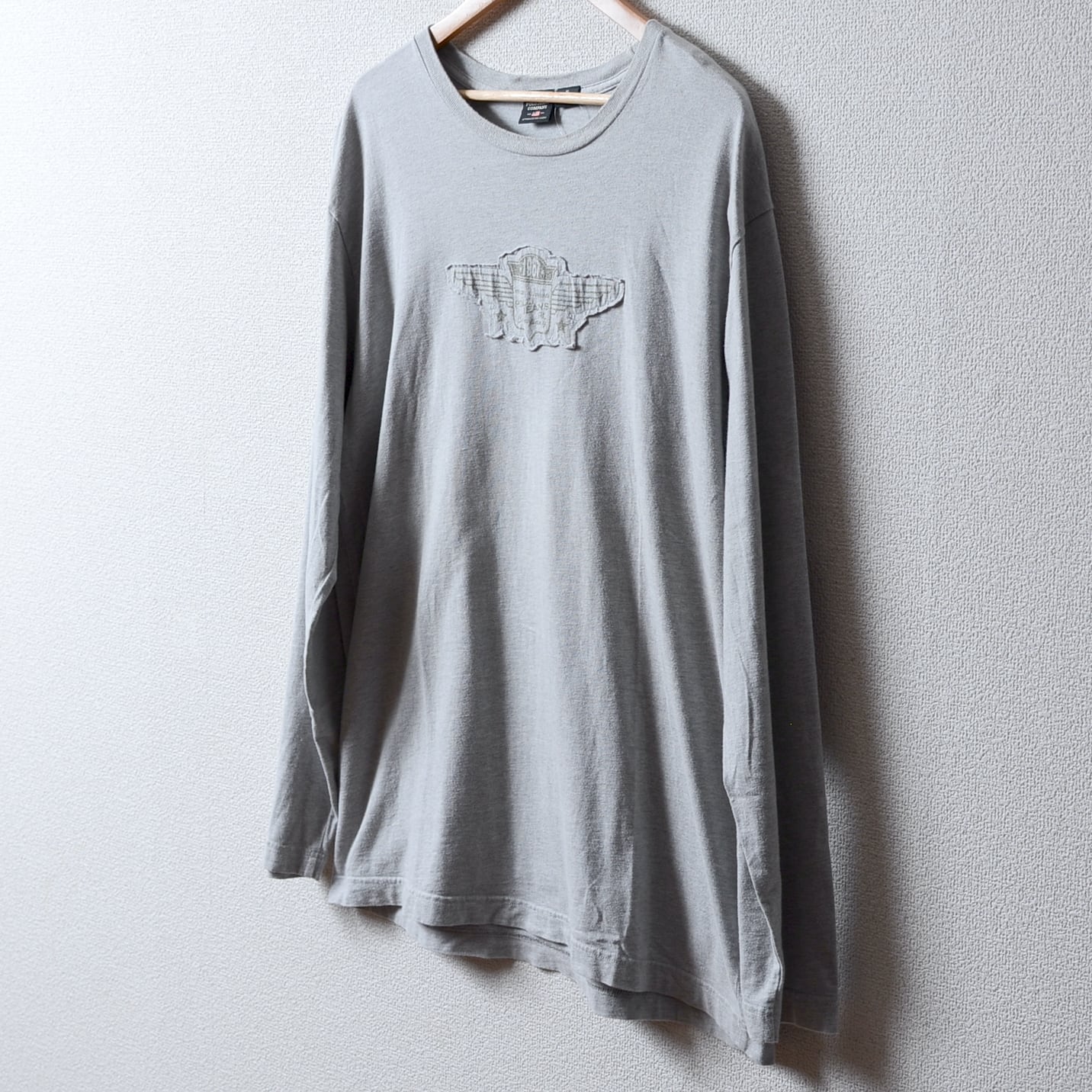 グレーの長袖Tシャツ、刺繍ロゴ付き、XLサイズ。
