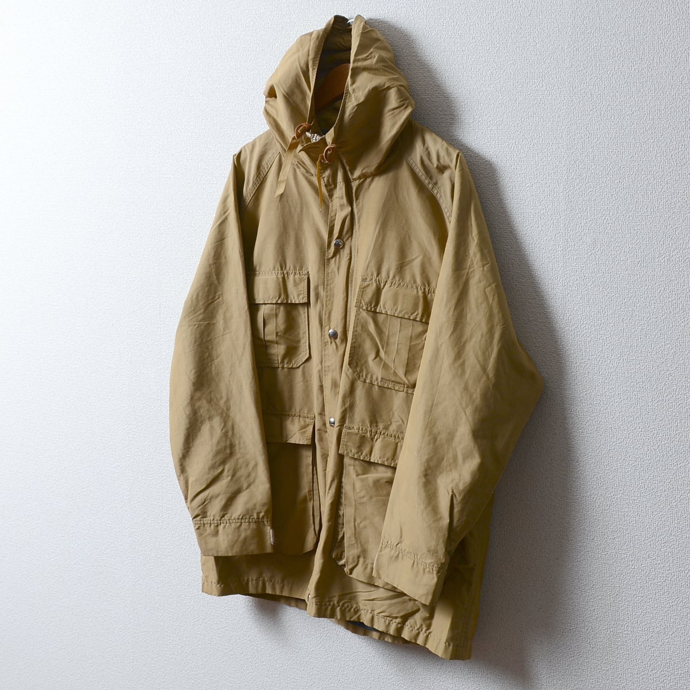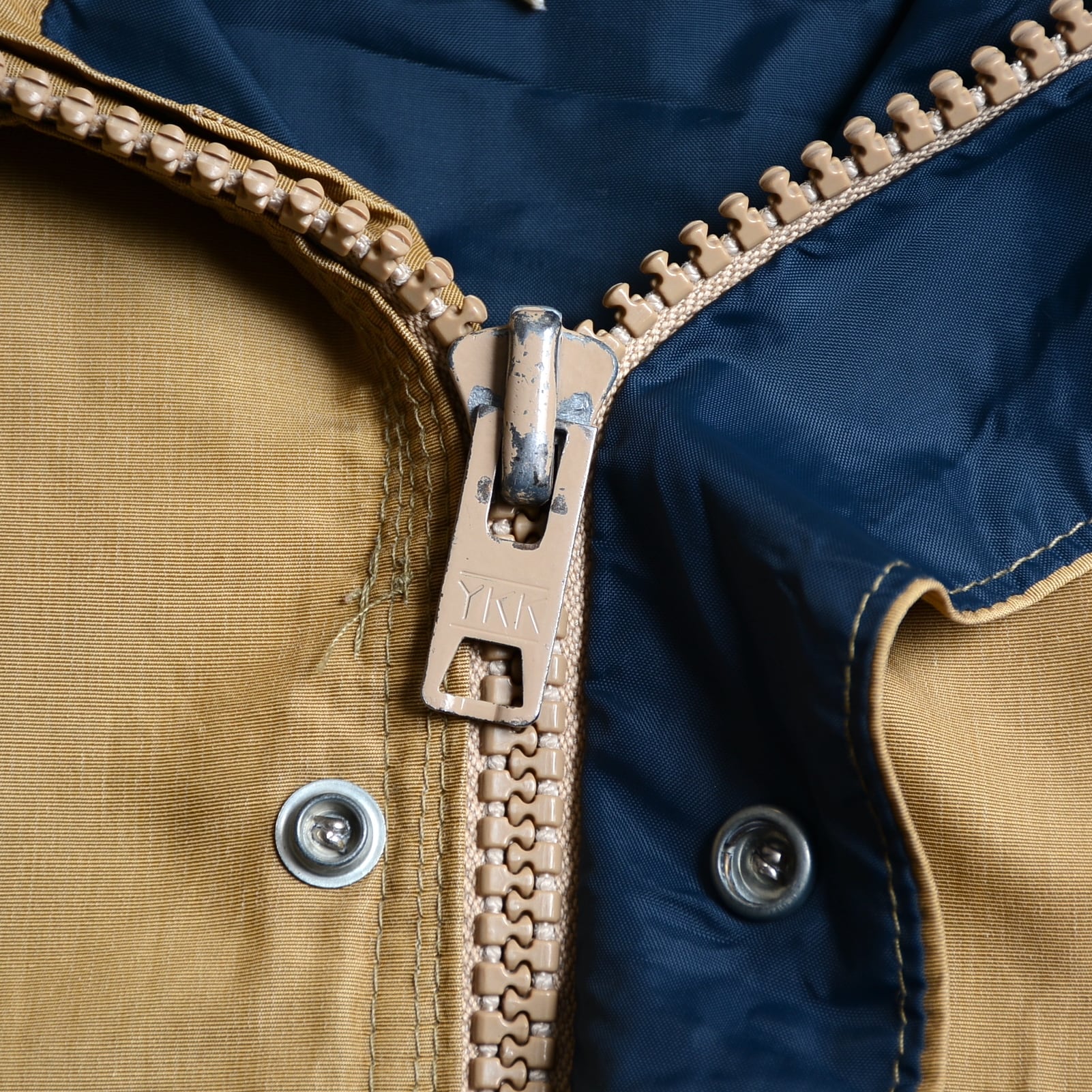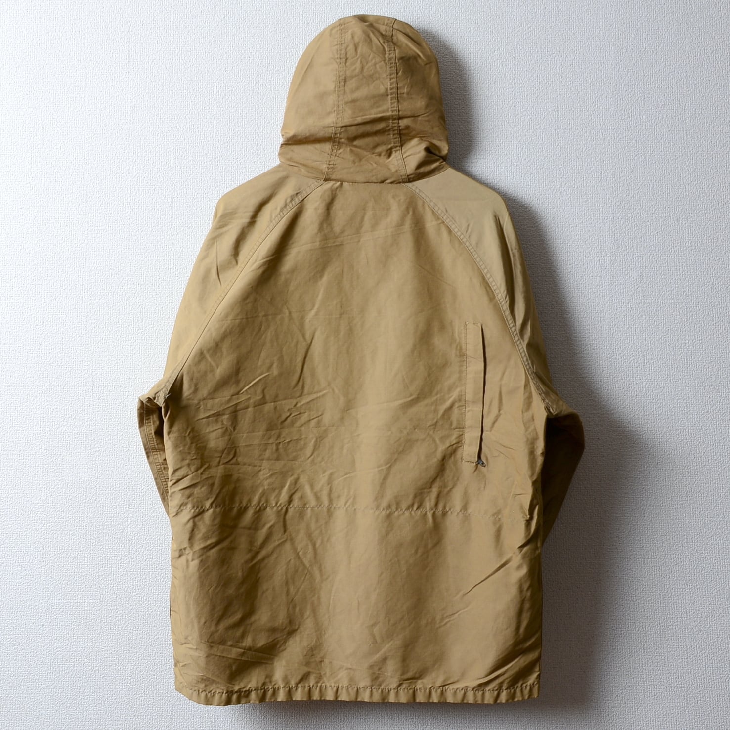 70年代製のフード付きのベージュマウンテンパーカー、US Lサイズ、機能的な多ポケットデザイン。