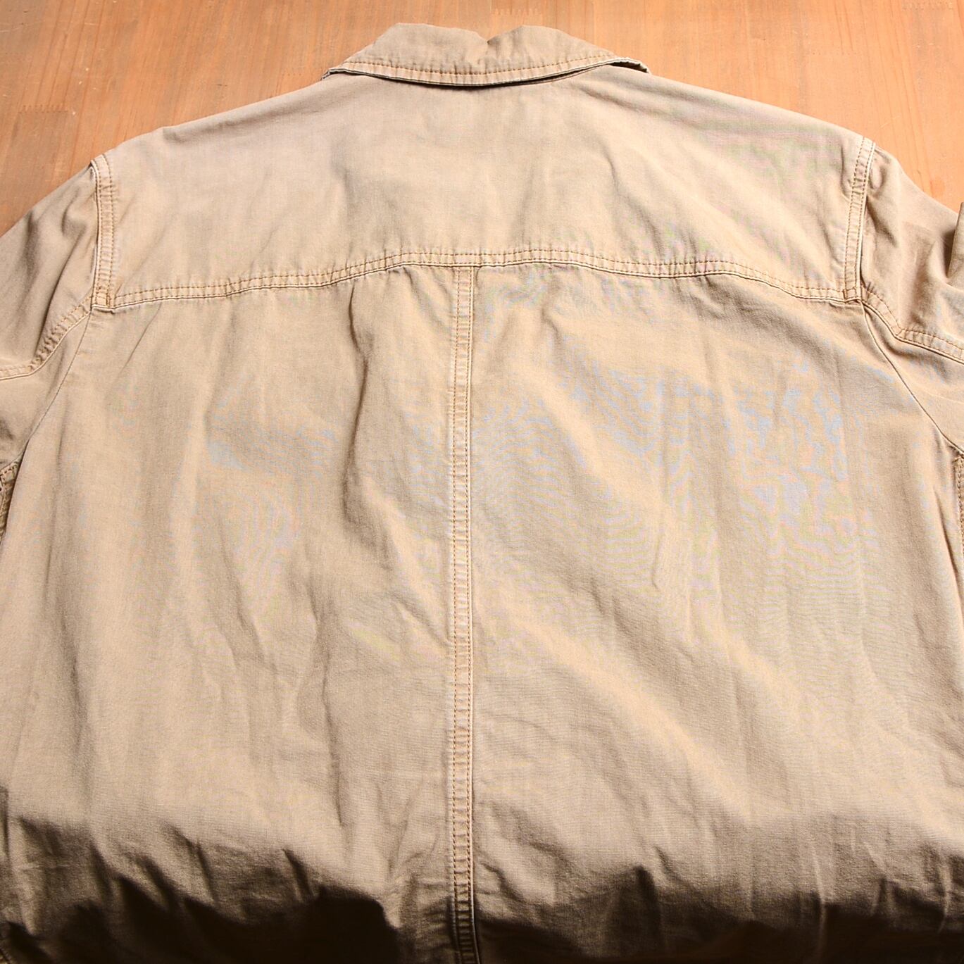 ミリタリースタイルのベージュジャケット、Mサイズ、フラップポケット付き。