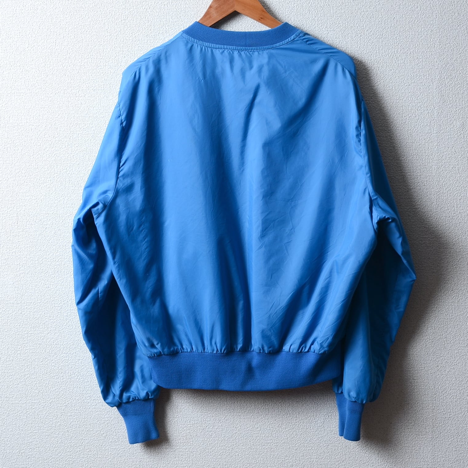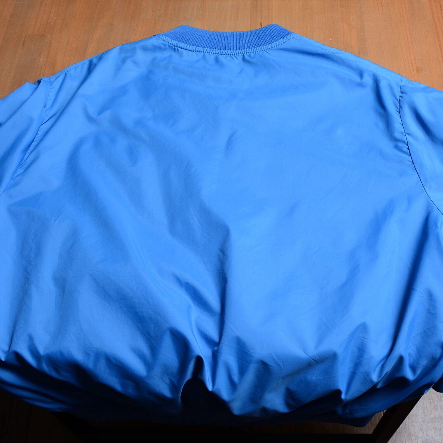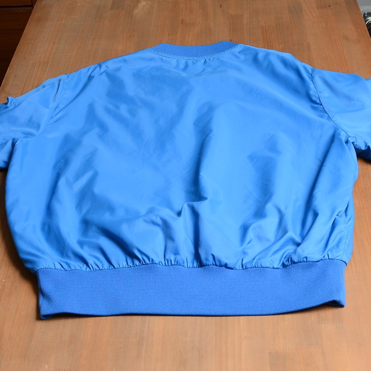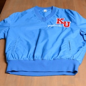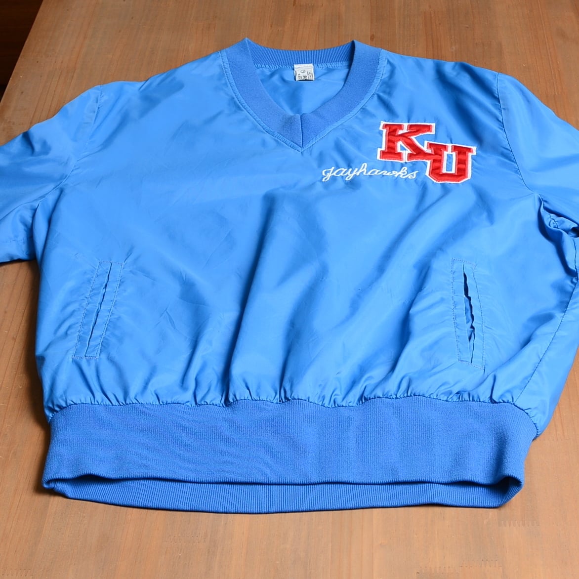 青のナイロンプルオーバージャケット、Vネックデザイン、KUとjayhawksの刺繍付き。