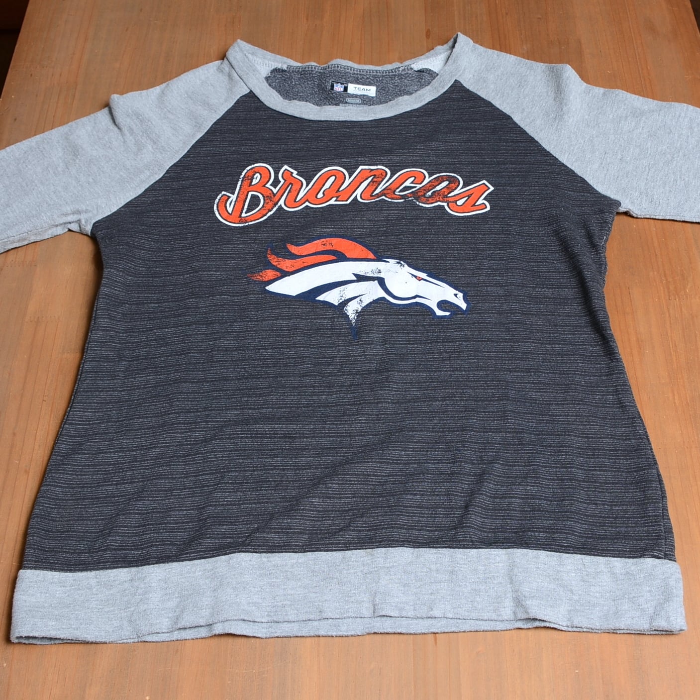 NFL BroncosのレディースMサイズスウェットシャツ、グレーとダークグレーのコンビネーション。