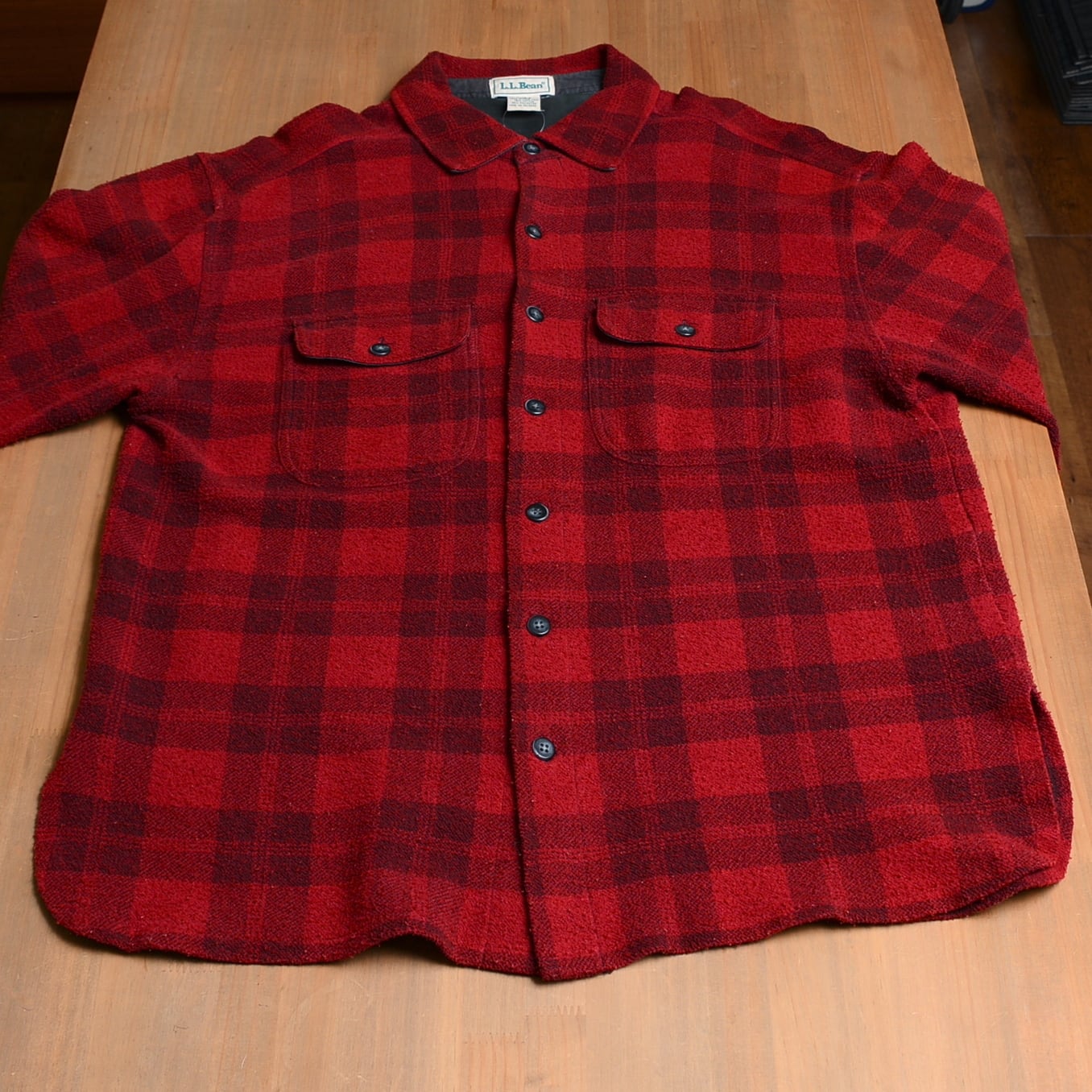 80年代のL.L.Bean製のレッドチェックネルシャツ、コットン75%、ポリエステル25%、US Lサイズ。